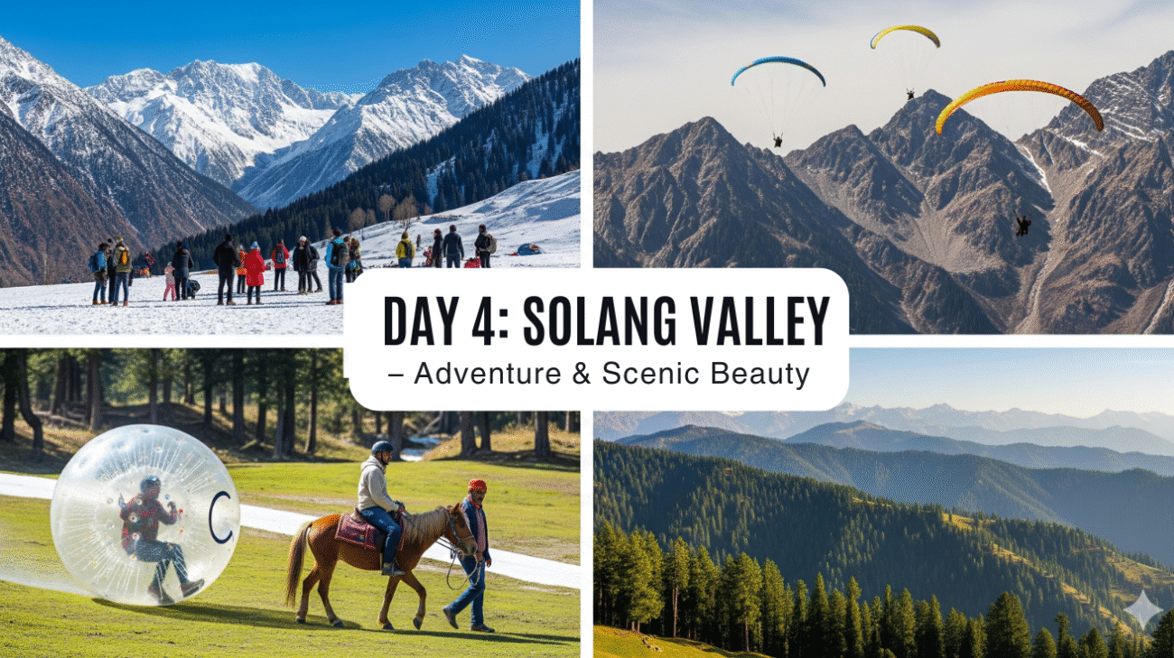 - Morning: Drive to Solang Valley, a picturesque valley with breathtaking views of snow-capped mountains.