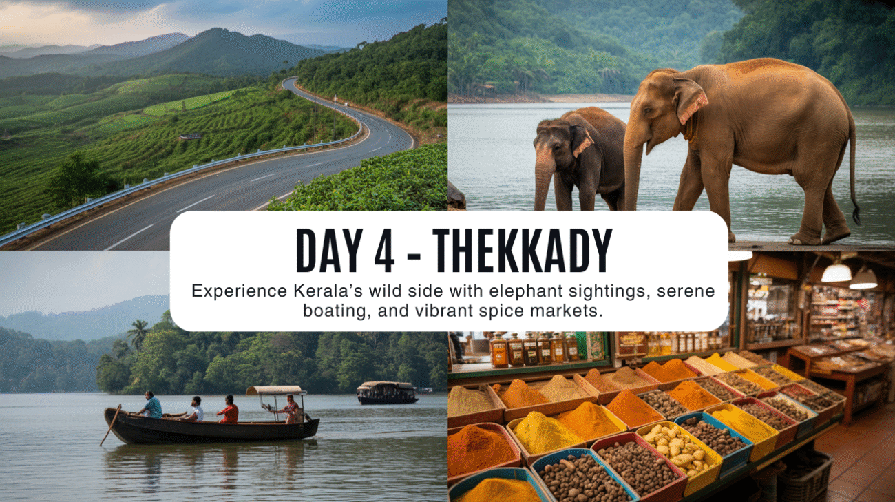 - Morning: Drive from Munnar to Thekkady (approx. 2-3 hours journey).