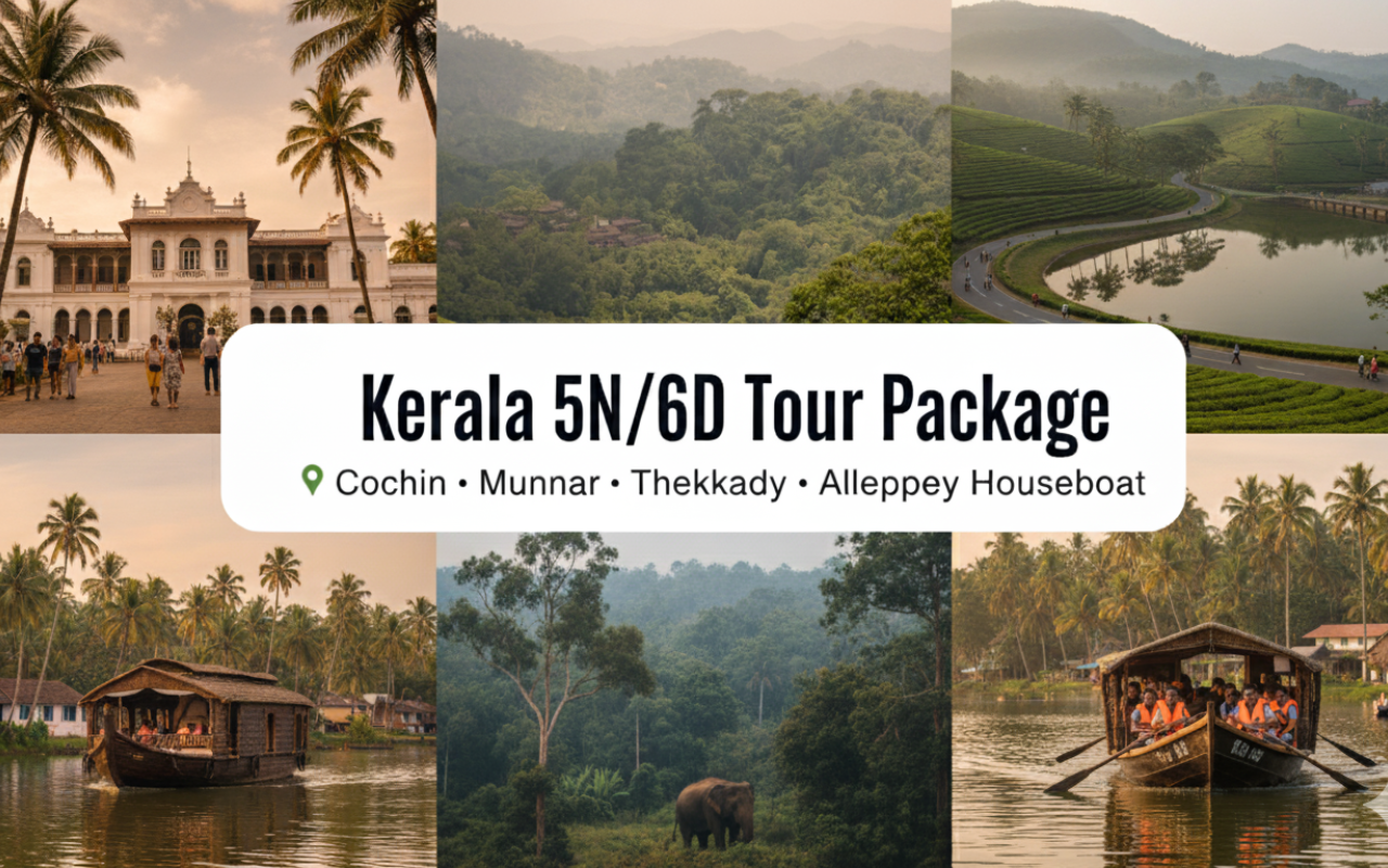 1-night Cochin, 2-night Munnar, 1-night Thekkady, and 1-night Alleppey Houseboat package with breakfast and dinner: