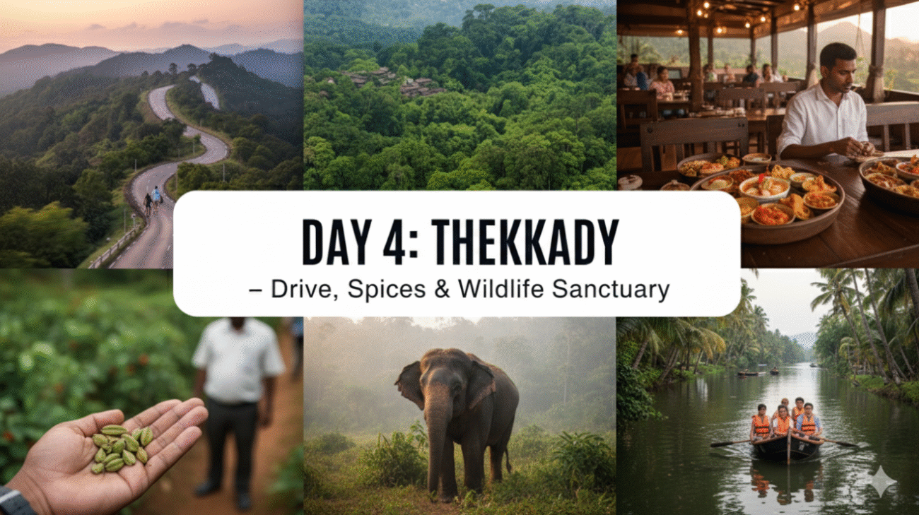- Morning: Drive from Munnar to Thekkady (approx. 2-3 hours journey).
