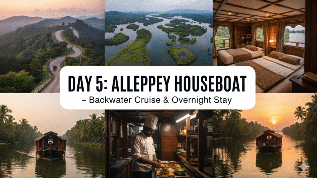 - Morning: Drive from Thekkady to Alleppey (approx. 3-4 hours journey).