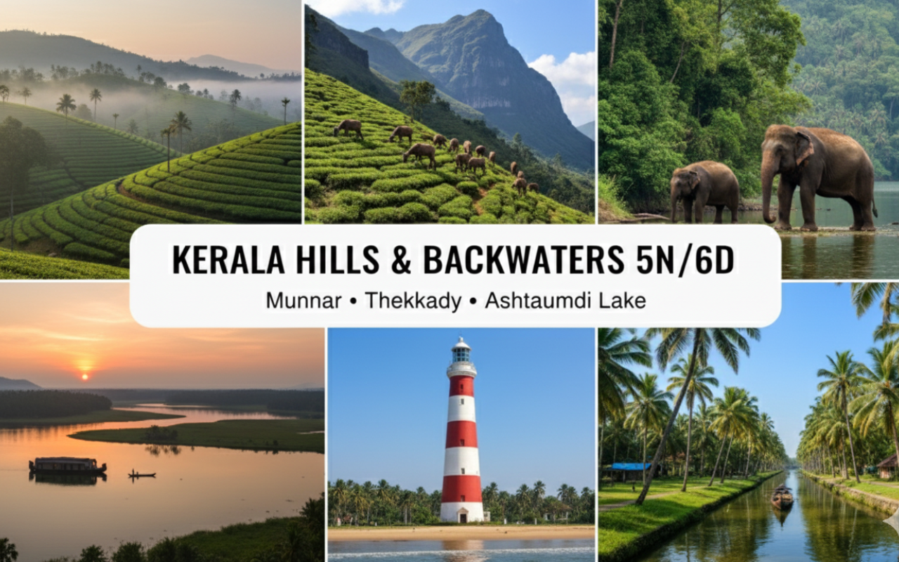 2-night Munnar, 1-night Thekkady, and 2-night Asthamudi package with breakfast and dinner: