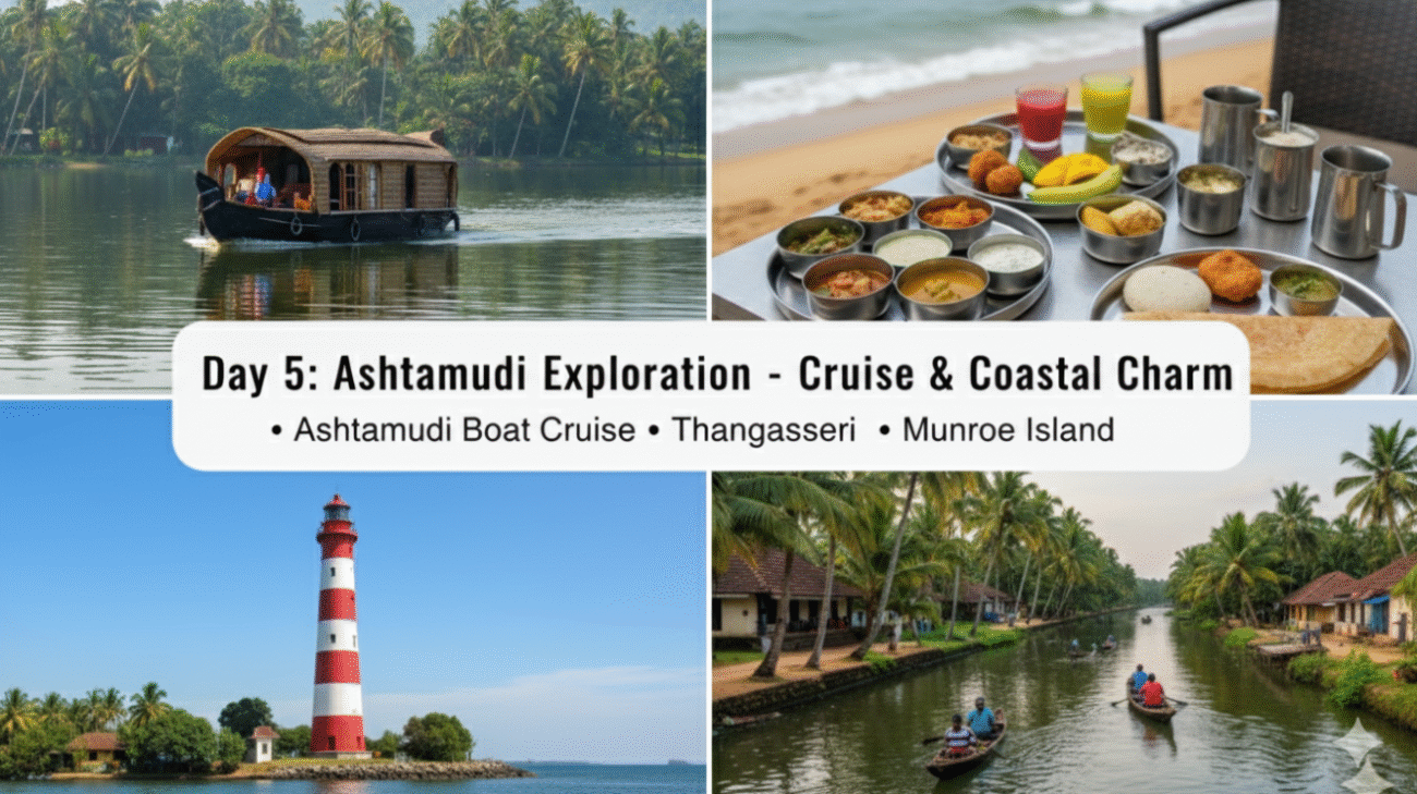 - Morning: Enjoy a boat cruise on the Asthamudi Lake.