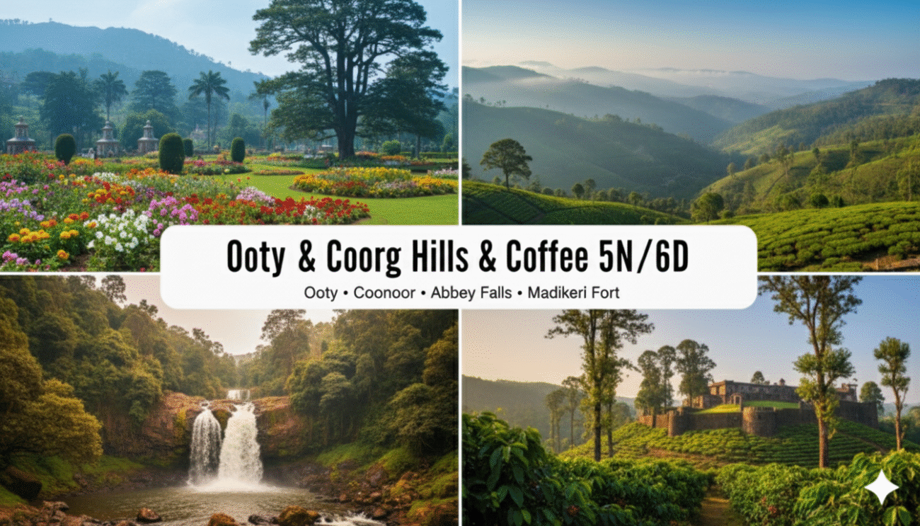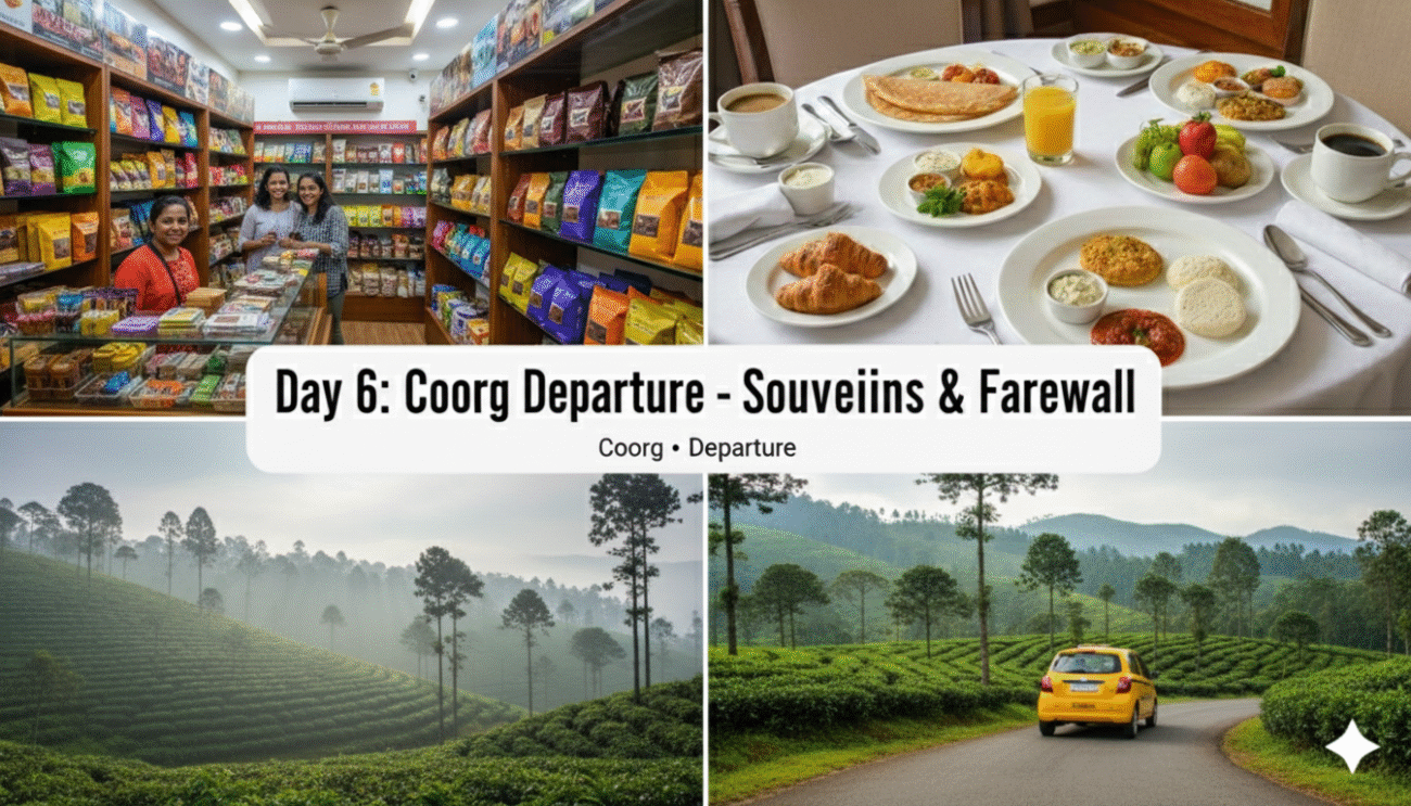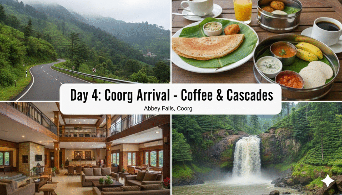 - Morning: Drive from Ooty to Coorg (approx. 4-5 hours journey).